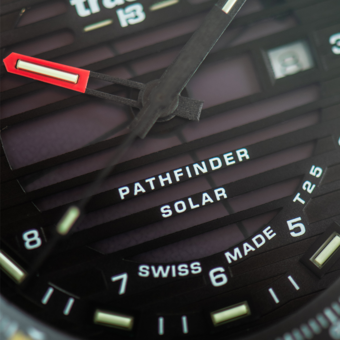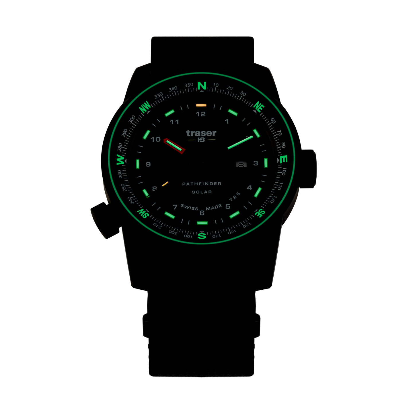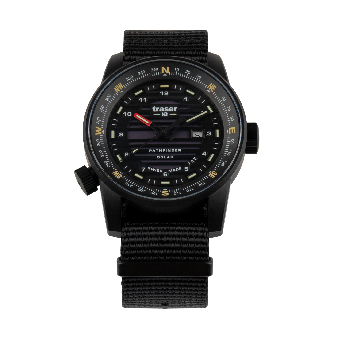 Matowa, czarna koperta ze stali szlachetnej (PVD) o średnicy 46 mm łączy w sobie odporność na warunki zewnętrzne z oszczędną, męską estetyką. Szara tarcza solarna z indeksem kompasowym oraz wskazówki pokryte Super-LumiNovą i technologią trigalight® gwarantują doskonałą czytelność przez całą dobę – nawet w całkowitej ciemności. Szafirowe szkło z powłoką antyrefleksyjną i tekstylna bransoleta NATO zapewniają komfort i trwałość w każdych warunkach.