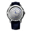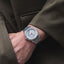 Tarcza wyróżnia się ręcznie opracowaną techniką anglage – fazowania krawędzi, znaną z wysokiego zegarmistrzostwa. Światło załamuje się na jej powierzchni, tworząc subtelną grę refleksów. Delikatny, niebieski okrąg akcentuje kompozycję i nawiązuje do sekundnika, a datownik na godzinie 6 integruje się z projektem, zachowując symetrię.