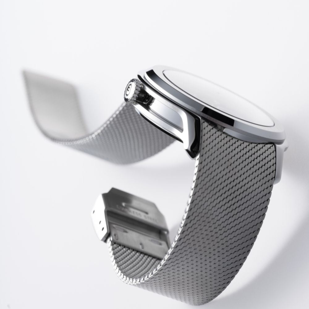 Koperta ze stali 316L o średnicy 39 mm została wykończona naprzemiennie szczotkowaniem i polerowaniem, co wzmacnia kontrasty i podkreśla geometryczną czystość projektu.
