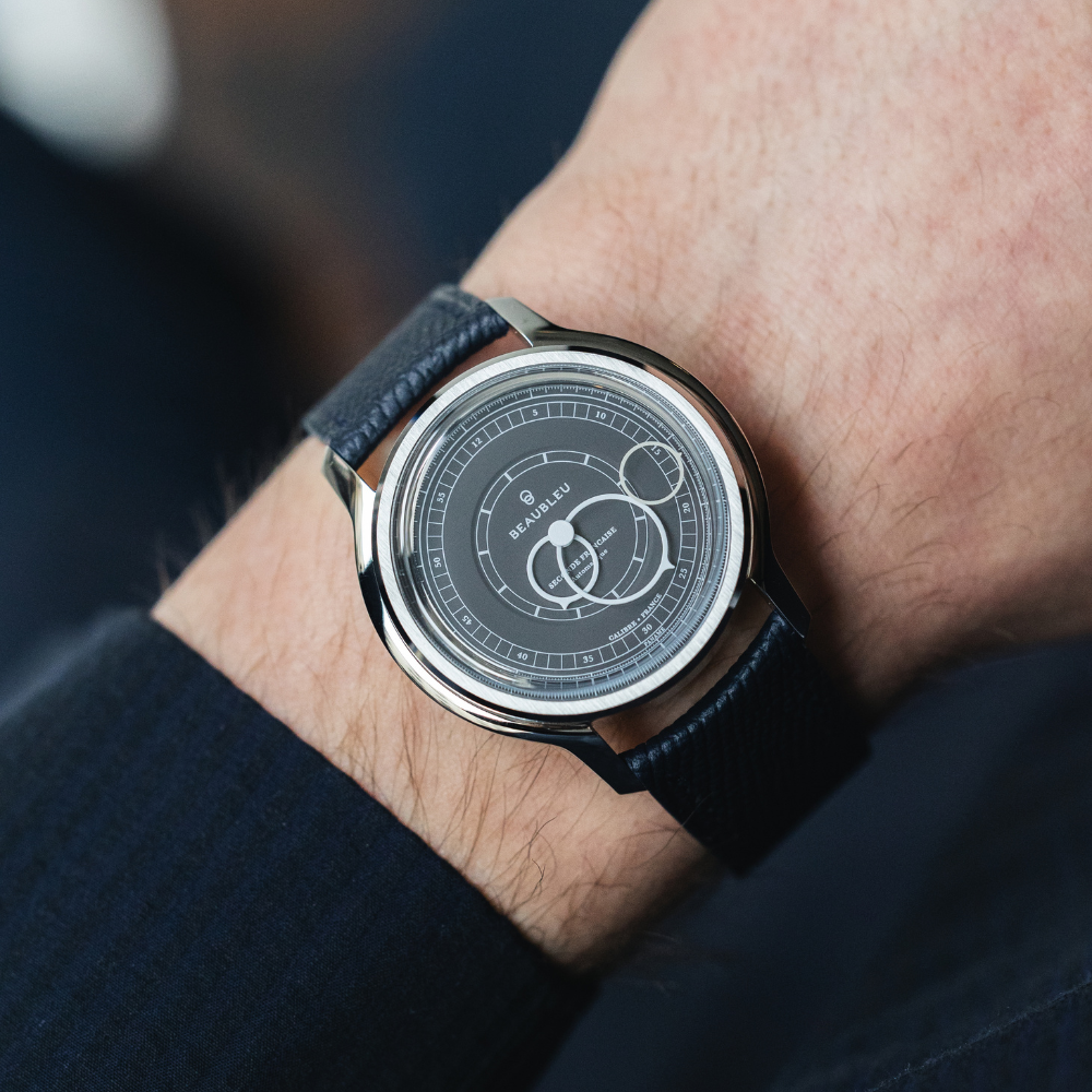 Tarcza w kolorze antracytowym przywodzi na myśl klasyczne zegarki instrumentowe XX wieku. Ziarnista struktura, drobna skala kolejowa oraz cyfry w stylu XVIII-wiecznym budują kompozycję o ponadczasowym charakterze.